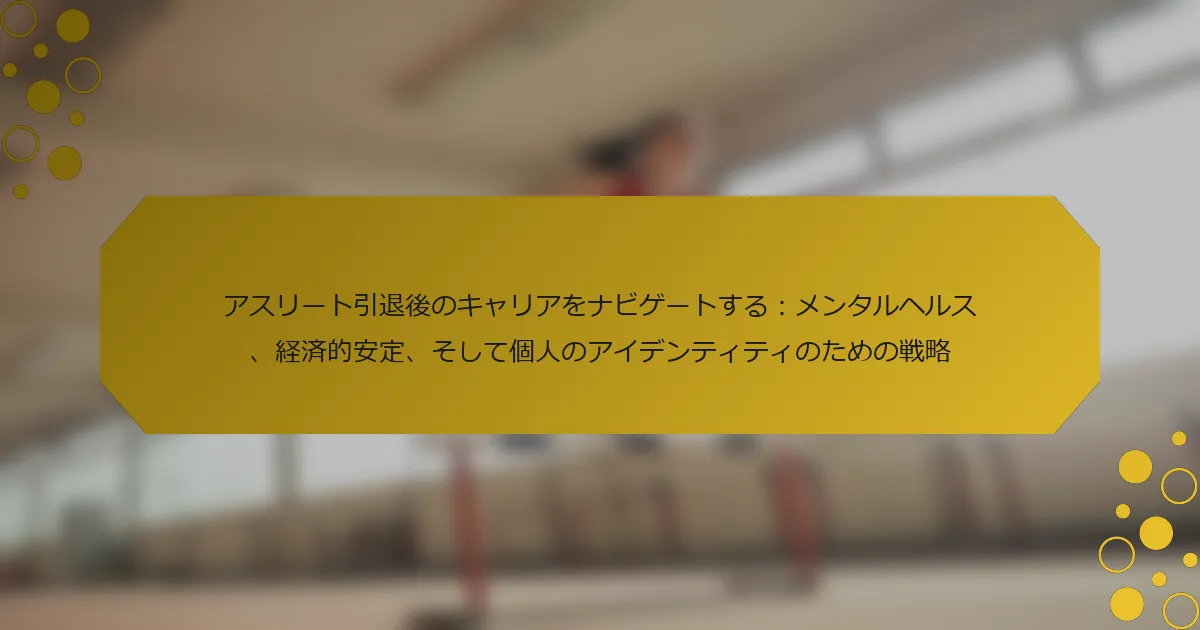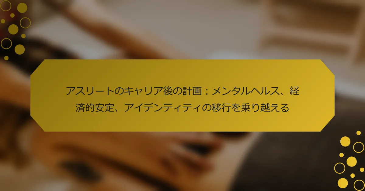 アスリートのキャリア後の計画は、メンタルヘルス、経済的安定、そして成功したアイデンティティの移行を確保するために重要です。アスリートは、スポーツの後の生活に適応する際に不安や抑うつに苦しむことがよくあります。しっかりとした財務計画を立てることで、突然の収入の変化を管理するのに役立ちます。アスリートとしての枠を超えた個人のアイデンティティを再定義することは、長期的な充実感にとって不可欠です。 アスリートはスポーツの後の生活にどのように移行するのか? アスリートは、メンタルヘルス、経済的安定、アイデンティティに焦点を当てることでスポーツの後の生活に移行します。彼らは新しいライフスタイルに適応する際にしばしば課題に直面し、それが不安や抑うつにつながることがあります。しっかりとした財務計画を立てることが重要であり、多くのアスリートが突然の収入の変化を経験します。さらに、スポーツを超えた個人のアイデンティティを再定義することは、長期的な充実感にとって不可欠です。専門的な指導を求めることで、これらの移行を効果的にナビゲートすることができます。 引退するアスリートが直面する一般的なメンタルヘルスの課題は何か? 引退するアスリートは、アイデンティティの喪失、不安、抑うつなどの一般的なメンタルヘルスの課題に直面することがよくあります。競争の激しい環境からの急激な移行は、無目的感を引き起こすことがあります。研究によると、引退したアスリートの約40%が重要なメンタルヘルスの問題を経験しており、これはしばしば構造化されたキャリア後の計画の欠如から生じています。さらに、経済的な不安定さがこれらの課題を悪化させる可能性があるため、アスリートが積極的なキャリア後の計画に取り組むことが重要です。 アスリートはキャリア後の経済的安定に向けてどのように準備できるか? アスリートは、堅実な財務計画を作成することでキャリア後の経済的安定を達成できます。彼らは財務教育に参加し、専門家のアドバイスを求め、賢く投資する必要があります。不動産や株式を含む多様なポートフォリオを構築することで、長期的なセキュリティを提供できます。財務の専門家や他のアスリートとのネットワーキングは、知識と機会を高めます。 アスリートにとっての重要な財務計画のステップは何か? アスリートは、キャリア後の長期的な安定を確保するために重要な財務計画のステップに従うべきです。まず、現在および将来の支出を考慮した包括的な予算を作成します。次に、少なくとも6ヶ月の生活費をカバーするための緊急基金を設立します。第三に、時間をかけて富を築くために多様な資産に投資します。第四に、財務アドバイザーと相談して、カスタマイズされた退職計画を策定します。最後に、アイデンティティの移行を効果的にナビゲートするために、メンタルヘルスリソースを優先します。 財務リテラシーはキャリア後の計画にどのような役割を果たすか? 財務リテラシーは、アスリートのキャリア後の計画において重要です。それは、彼らが財務を効果的に管理し、長期的な安定を確保する力を与えます。投資、予算編成、貯蓄を理解することで、アスリートは競技スポーツから新しいキャリアに移行しながら、財務の健康を維持することができます。この知識は、財務の不確実性に関連する不安を軽減し、この重要なライフチェンジの間にメンタルウェルビーイングを向上させます。さらに、強い財務リテラシーを持つアスリートは、未来についての情報に基づいた意思決定を行う能力が高まり、スポーツを超えたアイデンティティと自己価値を保持することができます。 引退後のアスリートが直面する独自のアイデンティティの問題は何か? アスリートは引退後に、目的の喪失、社会的孤立、自己価値の再定義の難しさなど、重要なアイデンティティの課題に直面します。構造化された高いプロファイルのライフスタイルから市民生活への移行は、抑うつや不安などのメンタルヘルスの問題を引き起こす可能性があります。多くのアスリートは、以前の地位に見合った新しい役割やキャリアを見つけるのに苦労し、それが不十分さの感情を悪化させることがあります。経済的不安定さもこの移行を複雑にし、一部のアスリートはスポーツの後の生活に十分に計画を立てていない場合があります。これらの独自のアイデンティティの問題は、メンタルヘルス、経済的安定、アイデンティティの移行に対処する包括的なキャリア後の計画の重要性を強調しています。 アスリートはスポーツを超えたアイデンティティをどのように再定義できるか? アスリートは、新しい情熱を探求し、地域社会への奉仕に参加し、教育を追求することで、スポーツを超えたアイデンティティを再定義できます。これらの活動は個人の成長を促進し、メンタルヘルスを向上させます。新しい役割への移行は、目