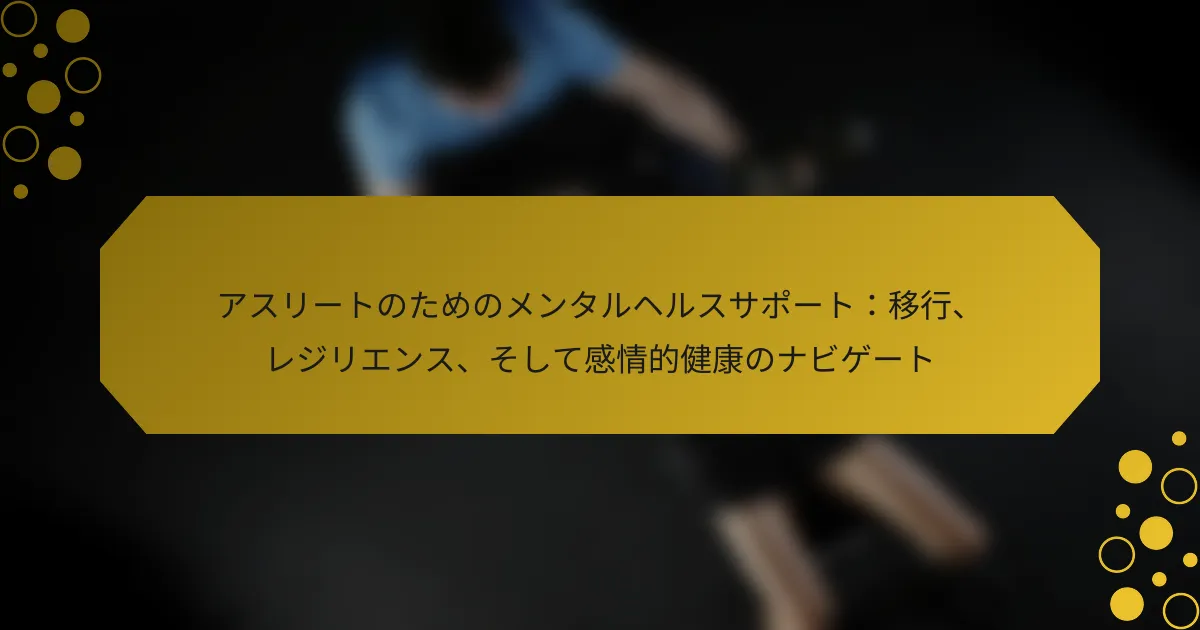 アスリートのメンタルヘルスサポートは、キャリア後の移行期間において重要であり、レジリエンスや感情的な健康に対処します。主な要素には、カウンセリングサービスへのアクセス、ピアサポートネットワーク、スキル開発ワークショップが含まれます。マインドフルネスの実践や効果的な目標設定は感情的なレジリエンスを高め、個別のケアやスティグマ軽減イニシアティブはメンタルヘルスについてのオープンな議論を促進します。構造化されたサポートシステムに参加することで、この困難な時期にアスリートのメンタルヘルスを大幅に改善することができます。 アスリートのメンタルヘルスサポート:キャリア後の移行を乗り越えるための主な要素は何ですか? キャリア後の移行におけるアスリートのメンタルヘルスサポートは、レジリエンスと感情的な健康に焦点を当てています。主な要素には、カウンセリングサービスへのアクセス、ピアサポートネットワーク、スキル開発ワークショップが含まれます。カウンセリングは、アイデンティティの変化に対処するための個別の戦略を提供し、ピアサポートは共有された経験を育みます。スキル開発は適応力を高め、新しいキャリアパスに備えることができます。これらのサポートを実施することで、不安や抑うつを大幅に軽減し、より健康的な移行を促進します。 なぜアスリートの移行中にメンタルヘルスが重要なのですか? アスリートの移行中にメンタルヘルスが重要なのは、それが彼らの感情的な健康とレジリエンスに直接影響を与えるからです。アスリートは、引退や役割の変化などの大きな変化に直面し、これがストレスやアイデンティティの危機を引き起こす可能性があります。適切なメンタルヘルスサポートは、これらの変化への適応を促進し、アスリートが前向きな見通しを維持し、引き続き成功を収めることを保証します。研究によると、移行中にメンタルヘルスリソースを受けるアスリートは、不安レベルが低く、生活満足度が向上することが示されています。このサポートは、競技後のキャリアにおける長期的な感情的健康と安定を育むために不可欠です。 引退はアスリートの感情的な健康にどのように影響しますか? 引退はアスリートの感情的な健康に大きな影響を与え、喪失感やアイデンティティの危機を引き起こす可能性があります。多くのアスリートは、アクティブなキャリアからの移行に苦労し、社会的な交流の減少や構造の喪失といった課題に直面します。この期間中、メンタルヘルスカウンセリングやピアネットワークを含む感情的サポートシステムが重要です。研究によると、メンタルヘルスサポートに参加するアスリートは、引退後のレジリエンスが高く、感情的な適応が良好であると報告しています。 引退したアスリートが直面する一般的なメンタルヘルスの課題は何ですか? 引退したアスリートは、うつ病、不安、アイデンティティの危機といったメンタルヘルスの課題に一般的に直面します。競技スポーツから日常生活への移行は、喪失感や不確実性を引き起こす可能性があります。研究によると、引退したアスリートの約30%が重大なメンタルヘルスの問題を経験しています。サポートシステムやメンタルヘルスリソースは、この移行期間中のレジリエンスと感情的健康を育むために重要です。 アイデンティティはアスリートのキャリア後のメンタルヘルスにどのような役割を果たしますか? アイデンティティは、アスリートのキャリア後のメンタルヘルスに大きな影響を与え、目的意識や自己価値感に影響します。非常に認知されたスポーツの人物から市民生活への移行は、アイデンティティの危機を引き起こし、不安やうつ病をもたらす可能性があります。研究によると、アスリートはしばしば地位やコミュニティの喪失に苦しみ、これがメンタルヘルスの課題を悪化させることがあります。スポーツを超えたアイデンティティを強化するサポートシステムは、この移行を助け、レジリエンスと感情的健康を育むことができます。新しい役割や活動に参加することで自己アイデンティティを再定義し、キャリア後のより健康的なメンタル状態を促進します。 引退後のルーチンの喪失はメンタルヘルスにどのように影響しますか? 引退後のルーチンの喪失は、メンタルヘルスに大きな影響を与える可能性があります。しばしば孤立感、動機の低下、不安を引き起こします。構造化された日常活動がないと、引退した個人は目的やアイデンティティに苦しむことがあり、これがメンタルヘルスの問題を悪化させる可能性があります。新しいルーチンを確立し、社会的活動に参加することで、これらの影響を軽減し、レジリエンスと感情的健康を促進することができます。 アスリートが感情的なレジリエンスを高めるための普遍的な戦略は何ですか? アスリートは、マインドフルネス、目標設定、社会的サポートを通じて感情的なレ