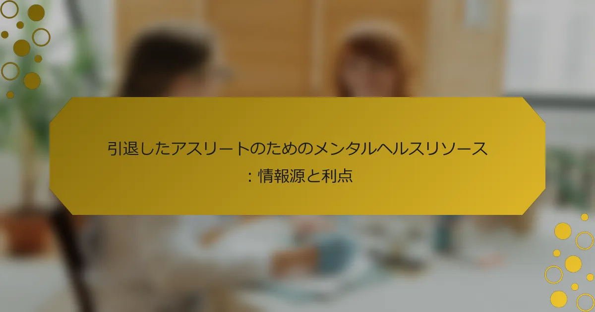 引退したアスリートは、アイデンティティの喪失や不安を含むメンタルヘルスの課題に直面することがよくあります。特化したカウンセリングサービス、サポートグループ、オンラインプラットフォームにアクセスすることで、重要な感情的サポートを得ることができます。これらのリソースはコミュニティのつながりを育み、対処メカニズムを強化し、全体的なメンタルレジリエンスを促進します。専門的なプログラムに参加することで、スポーツの後の生活をナビゲートする引退したアスリートの幸福感を大幅に向上させることができます。 引退したアスリートが利用できる主なメンタルヘルスリソースは何ですか? 引退したアスリートは、カウンセリングサービス、サポートグループ、オンラインプラットフォームなど、さまざまなメンタルヘルスリソースにアクセスできます。これらのリソースは、引退後のうつ病、不安、アイデンティティの喪失などの問題に対処するのに役立ちます。 カウンセリングサービスは、スポーツの後の生活に移行するアスリートに特化したサポートを提供することがよくあります。サポートグループはコミュニティのつながりを生み出し、孤独感を軽減します。オンラインプラットフォームは、さまざまなニーズに応じたアクセス可能な情報やバーチャルセラピーのオプションを提供します。 これらのリソースのユニークな特徴は、アスリートの経験に特化していることで、関連性が高く効果的なサポートを保証します。その結果、多くの引退したアスリートがこれらのサービスを利用することでメンタルウェルビーイングが改善されたと報告しています。 これらのリソースは一般的なメンタルヘルスの課題にどのように対処しますか? 引退したアスリート向けのメンタルヘルスリソースは、特化したサポートシステムを提供することで一般的な課題に効果的に対処します。これらのリソースは、カウンセリング、ピアサポートグループ、対処戦略に焦点を当てたワークショップへのアクセスを提供します。このようなサポートは、引退したアスリートの間で広く見られる孤独感や不安感を軽減することができます。さらに、リソースはしばしば身体の健康を強調し、アクティブなライフスタイルを維持することがメンタルヘルスの結果を大幅に改善する可能性があることを示しています。アスリート向けに特別に設計されたプログラムは、競技スポーツから日常生活への移行を助け、独自の心理的ニーズに対処します。 引退したアスリートのメンタルヘルスサポートに焦点を当てた組織はどれですか? 引退したアスリートのメンタルヘルスサポートに焦点を当てた組織には、プロアスリート財団、NFLプレイヤーケア財団、メンタルヘルス財団があります。これらの組織は、引退したアスリートが直面する独自の課題に特化したリソース、カウンセリング、プログラムを提供します。彼らは、うつ病、不安、スポーツ後の生活への移行などの問題に対処することを目指しています。 プロアスリート財団はどのようなサービスを提供していますか? プロアスリート財団は、引退したアスリート向けに特別に設計されたメンタルヘルスリソースを提供しています。これらのサービスには、メンタルウェルネスに焦点を当てたカウンセリング、サポートグループ、教育ワークショップが含まれます。さらに、元アスリートが直面する独自の課題を理解する専門のメンタルヘルススペシャリストへのアクセスも提供しています。この財団はメンタルヘルスの重要性を強調し、プロスポーツからの移行を行う人々のためのサポートコミュニティを育成することを目指しています。 NFLプレイヤーケア財団は元選手をどのように支援していますか? NFLプレイヤーケア財団は、カウンセリングサービス、サポートグループ、ウェルネスプログラムを通じて元選手を支援するメンタルヘルスリソースを提供しています。これらの取り組みは、引退したアスリートが直面する独自の課題、特にうつ病や不安に対処します。この財団のメンタルウェルビーイングへの焦点は、引退した選手の生活の質を向上させることへのコミットメントを反映しています。特化したリソースを提供することで、財団は元アスリートが移行をナビゲートし、メンタルヘルスを維持するのを助けています。 ピアサポートネットワークはメンタルヘルス回復にどのような役割を果たしますか? ピアサポートネットワークは、引退したアスリートのメンタルヘルス回復を大幅に向上させます。彼らは感情的なサポート、共有された経験、実用的なアドバイスを提供し、レジリエンスを育み、孤独感を軽減します。似たような課題を理解する仲間と関わることで、メンタルウェルビーイングが向上し、コミュニティの感覚が強まります。研究によると、これらのネットワークに関与するアスリートは、回復の旅においてより高い満足度を報告しています。 