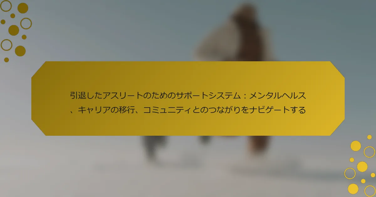 引退したアスリートは、メンタルヘルス、キャリアの移行、コミュニティとのつながりに関連する課題に直面することがよくあります。メンタルヘルスカウンセリング、キャリアコーチング、ピアサポートグループなどのサポートシステムは、これらの問題を乗り越えるために不可欠です。専門的なリソースは、アイデンティティの喪失や感情の調整に対処し、コミュニティの関与イニシアティブは社会的つながりを促進します。これらの戦略を組み合わせることで、引退後のウェルビーイングを向上させるためのホリスティックなアプローチが生まれます。 引退したアスリートにとって必要なサポートシステムは何ですか? 引退したアスリートは、メンタルヘルス、キャリアの移行、コミュニティとのつながりに対処するための必要なサポートシステムの恩恵を受けます。これらのシステムには、メンタルヘルスカウンセリング、キャリアコーチング、ピアサポートグループが含まれます。メンタルヘルスカウンセリングは、アスリートがアイデンティティの喪失や感情的な課題に対処するのを助けます。キャリアコーチングは、新しい職業の道を見つけるための指導を提供し、彼らのスキルや経験を活用します。ピアサポートグループはコミュニティのつながりを育み、引退したアスリートが経験を共有し、ネットワークを構築できるようにします。これらのサポートシステムは、スポーツ後の生活へのスムーズな移行を促進します。 メンタルヘルスの課題は引退したアスリートにどのように影響しますか? メンタルヘルスの課題は、引退したアスリートに大きな影響を与え、うつ病、不安、アイデンティティの危機などの問題を引き起こすことがあります。競技キャリアからの移行はしばしば目的の喪失をもたらし、サポートシステムが重要になります。コミュニティのつながりや専門的な助けは、これらの課題を軽減することができます。研究によると、引退したアスリートは一般の人々と比べてメンタルヘルスの問題のリスクが高いことが示されています。強固なサポートネットワークを構築することで、彼らのウェルビーイングを向上させ、キャリアの移行をスムーズにすることができます。 キャリアの移行はメンタルウェルビーイングにどのような役割を果たしますか? キャリアの移行は、レジリエンスと適応力を育むことによってメンタルウェルビーイングに大きな影響を与えます。カウンセリングやピアネットワークを含むサポートシステムは、重要な感情的リソースを提供します。研究によると、構造化された移行プログラムに参加するアスリートは、より低い不安やうつ病のレベルを報告しています。これらのプログラムは自己肯定感を高め、目的意識を促進し、引退後のメンタルヘルスを維持するために重要です。 アスリートのキャリア移行の段階は何ですか? アスリートのキャリア移行の段階は、通常、評価、探求、準備、実施、反省を含みます。それぞれの段階は、個人および職業の成長に向けた独自の課題と機会に対処します。 評価は、スポーツ以外のスキルや興味を評価することを含みます。探求は、潜在的なキャリアパスや教育の機会を調査することに焦点を当てます。準備は、必要な資格を取得し、選択した分野でネットワーキングを行うことを含みます。実施は、新しいキャリアへの実際の移行であり、しばしばレジリエンスと適応力を必要とします。反省は、アスリートが自分の経験を評価し、必要に応じてキャリア目標を調整することを可能にします。 引退したアスリートはどのようにしてキャリア後のアイデンティティを特定できますか? 引退したアスリートは、メンタルヘルス、キャリアの移行、コミュニティとのつながりに焦点を当てたサポートシステムを活用することで、キャリア後のアイデンティティを特定できます。メンタルヘルスの専門家と関わることで、この変革の段階で必要な指導を受けることができます。引退したアスリート同士のネットワーキングは、帰属意識や共有された経験を育みます。ワークショップやメンターシッププログラムを通じて新しいキャリアの機会を探ることで、アスリートは自分の目的を再定義する手助けができます。最後に、コミュニティイベントに参加することで社会的な絆が強まり、個人的な充実感が高まります。 引退したアスリートにとって重要なコミュニティのつながりは何ですか? 引退したアスリートにとって重要なコミュニティのつながりには、ピアサポートグループ、メンターシッププログラム、地域のスポーツ団体が含まれます。これらのつながりは、感情的なウェルビーイングを育み、キャリアの移行を促進し、社会的な関与を促します。元チームメイトやアスリートと関わることで、経験に対する共通の理解が生まれ、メンタルヘルスが向上します。さらに、コミュニティへの関与は、スキルの開発やネットワーキングの機会