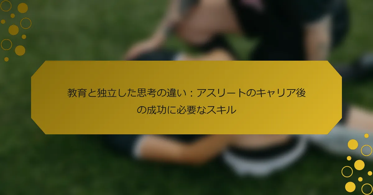アスリートのキャリア後の成功は、教育と独立した思考という2つの重要なスキルに依存しています。教育は体系的な知識を提供し、独立した思考は適応力と問題解決能力を育みます。アスリートはこれらのスキルを組み合わせることで、新たな課題を効果的に乗り越えることができます。自己反省や多様な視点を通じて独立した思考を育てることは、スポーツを超えた生活への移行における意思決定能力やレジリエンスを高めます。 教育と独立した思考の違いは何ですか? 教育は体系的な知識を提供し、独立した思考は個人の意思決定を促進します。アスリートはキャリア後の成功のために、両方のスキルから恩恵を受けます。教育は彼らに必要な情報を提供し、独立した思考は適応力と問題解決能力を高めます。この組み合わせにより、アスリートは新たな課題を効果的に乗り越えることができます。これらのスキルを発展させることは、スポーツの後の生活への移行に大きな影響を与える可能性があります。 教育と独立した思考はアスリートの成功にどのように貢献しますか? 教育と独立した思考は、アスリートのキャリア後の成功にとって重要です。教育は知識とスキルを提供し、独立した思考は適応力と問題解決能力を育みます。これらの特性は、アスリートがスポーツキャリアの後に新しい役割に効果的に移行するのを可能にします。研究によれば、教育を受けたアスリートは多様なキャリアパスを追求する可能性が高く、長期的な成功を高めます。独立した思考は、彼らが課題を乗り越え、機会をつかむことを可能にし、スポーツを超えた持続的な成果を確保します。 キャリア後の成功に必要な基本的なスキルは何ですか? アスリートはキャリア後の成功のために、教育と独立した思考の組み合わせが必要です。基本的なスキルには、金融リテラシー、ネットワーキング能力、適応力が含まれます。金融リテラシーは収入を効果的に管理するのに役立ち、ネットワーキングはさまざまな分野での機会を育みます。適応力はアスリートが新しい役割にシームレスに移行できるようにします。独立した思考は意思決定を高め、アスリートが自信を持って課題を乗り越えることを可能にします。これらのスキルを組み合わせることで、アスリートは成功するキャリア後の旅に備えることができます。 アスリートにとって普遍的に有益なスキルは何ですか? キャリア後のアスリートにとって重要なスキルには、教育と独立した思考が含まれます。これらのスキルは、多様な環境での適応力を可能にし、意思決定能力を高めます。教育は基礎的な知識を提供し、独立した思考は革新と問題解決を促進します。どちらもスポーツの後の生活をナビゲートするために不可欠です。これらのスキルを発展させることは、さまざまなキャリアへの成功した移行を促し、長期的な成功を確保します。 成功したアスリートを際立たせるユニークなスキルは何ですか? 成功したアスリートは、独立した思考と適応力を通じて自分を際立たせ、キャリア後の成功に不可欠です。教育は基礎的な知識を提供しますが、独立して革新し問題を解決する能力は機会を高めます。ユニークなスキルには、戦略的意思決定、レジリエンス、効果的なコミュニケーションが含まれます。これらの特性は、アスリートがスポーツを超えた課題を乗り越え、新しいキャリアへの成功した移行を促進します。 アスリートの移行を向上させる珍しい特性は何ですか? アスリートは、適応力、感情知能、ネットワーキングスキルといった珍しい特性を発展させることで移行を向上させることができます。これらの特性は、キャリア後の課題を成功裏に乗り越えるのを助けます。適応力はアスリートが新しい環境に適応することを可能にし、感情知能は関係を理解し管理するのに役立ちます。ネットワーキングスキルは、キャリアの成長に必要なコラボレーションやメンターシップの機会を生み出します。 引退後のアスリートにとって独立した思考が重要な理由は何ですか? 独立した思考は、アスリートが引退後に適応力とレジリエンスを育むために重要です。従来の教育は往々にして暗記学習に焦点を当てるのに対し、独立した思考は批判的分析と個人の意思決定を促します。このスキルは、引退したアスリートが新たな課題や機会を効果的に乗り越えるのを可能にします。たとえば、多くのアスリートはスポーツを離れた後にアイデンティティの危機に直面しますが、独立した思考は彼らが目標を再定義し、新しい情熱を追求するのを助けます。さらに、このマインドセットは、起業活動や地域のイニシアチブに関与する能力を高め、最終的には充実したキャリア後の生活につながります。 教育はアスリートの未来をどのように形作りますか? 教育は、アスリートのキャリア後の成功に必要なスキルを提供することで、彼らの未来に大きな影響を与えます。教育は批判的思考、問題
