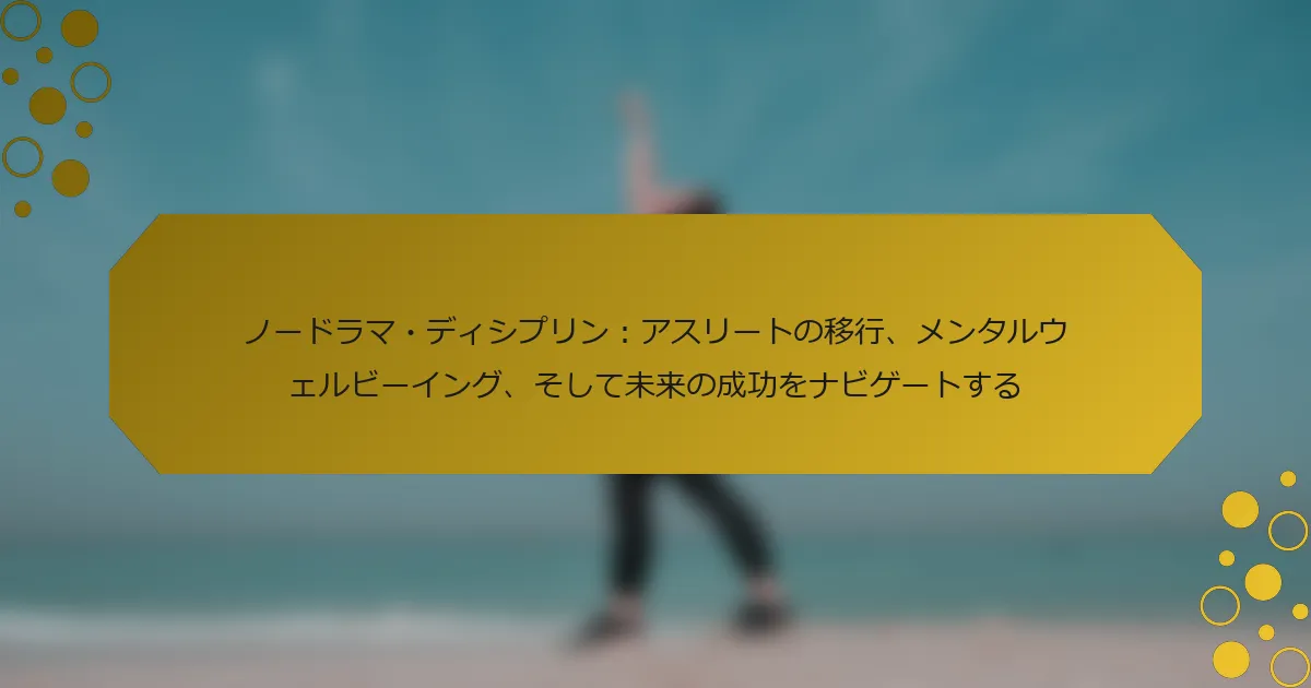 アスリートがアスリートキャリアからスポーツ後の生活への移行をナビゲートすることは、多くのアスリートにとって挑戦的です。No Drama Disciplineは、構造化された計画、メンタルヘルスサポート、スキル開発を強調しています。明確なロードマップを確立し、新しいスキルに取り組むことで、キャリアの機会を開くことができます。メンタルヘルスの問題に対処し、地域のリソースを活用することは、レジリエンスを育み、将来の成功を確保するために重要です。 アスリートはどのように効果的にキャリア後の生活に移行できますか? アスリートは、構造化された計画、メンタルヘルスサポート、スキル開発を受け入れることで、効果的にキャリア後の生活に移行できます。明確なロードマップを確立することは、将来の目標を設定するのに役立ちます。メンタルウェルビーイングは重要であり、セラピーや仲間のサポートを求めることでレジリエンスを育むことができます。新しいスキルや教育に取り組むことで、キャリアの機会が開かれ、成功した移行を確保します。 この移行中に直面する一般的な課題は何ですか? アスリートは、アイデンティティの喪失、パフォーマンス不安、社会的孤立など、移行中にさまざまな課題に直面することがよくあります。これらの問題は、メンタルウェルビーイングや将来の成功に大きな影響を与える可能性があります。アイデンティティの喪失は、アスリートがスポーツの外で自分自身を再定義するのに苦労する時に発生します。パフォーマンス不安は、新しい役割で成功するプレッシャーから生じることがあります。社会的孤立は、馴染みのあるチーム環境を離れることから生じることがあります。これらの課題に対処することは、移行プロセスを効果的にナビゲートするために不可欠です。 アイデンティティの喪失はスポーツ後のメンタルヘルスにどのように影響しますか? アイデンティティの喪失は、スポーツ後のメンタルヘルスに大きな影響を与え、不安や抑うつを引き起こします。アスリートは、スポーツを超えた生活への移行に苦労し、孤立感や自己価値の低下を感じることがよくあります。研究によると、引退したアスリートの約30%がこのアイデンティティの変化に関連するメンタルヘルスの問題を経験しています。サポートシステムやメンタルヘルスリソースは、アスリートがこれらの変化を成功裏にナビゲートするのに重要です。アイデンティティの喪失に対処することで、全体的なメンタルウェルビーイングを向上させ、スポーツ後の取り組みにおける将来の成功を促進できます。 成功した移行において計画はどのような役割を果たしますか? 計画は成功した移行にとって重要であり、変化を管理するための構造化されたアプローチを提供します。効果的な計画は、アスリートがメンタルチャレンジをナビゲートし、将来の明確な目標を設定するのに役立ちます。計画は、アスリートが適応する能力を高め、移行プロセス全体を通じてメンタルウェルビーイングを維持することを保証します。ステップを概説し、障害を予測することで、アスリートは成功へのロードマップを作成し、ストレスや不確実性を最小限に抑えることができます。この積極的なアプローチはレジリエンスを育み、アスリートが現在の状況を超えて繁栄する力を与えます。 キャリア後の計画を作成するための重要なステップは何ですか? キャリア後の計画を作成するために、アスリートは次の重要なステップに従うべきです:個人の価値観や関心を評価し、将来の明確な目標を設定し、サポートネットワークを構築し、専門的な指導を求めることです。これらのステップはメンタルウェルビーイングを促進し、スポーツ後の生活への成功した移行を促進します。 1. 個人の価値観と関心を評価する:最も重要なことを反映し、アスリート以外の情熱を特定します。 2. 明確な目標を設定する:個人の願望に沿った短期および長期の目標を設定します。 3. サポートネットワークを構築する:指導や励ましを提供できるメンター、仲間、専門家とつながります。 4. 専門的な指導を求める:アスリートの移行を専門とするキャリアコーチやカウンセラーに相談することを検討します。 目標設定は移行プロセスにどのように役立ちますか? 目標設定は、方向性とモチベーションを提供することで、移行プロセスに大いに役立ちます。明確な目標は、アスリートが困難な変化の中でメンタルウェルビーイングや将来の成功に集中するのを助けます。目標は自己効力感を高め、アスリートが進捗を追跡し、成果を祝うことを可能にします。この構造化されたアプローチは不安を軽減し、レジリエンスを育むため、移行を効果的にナビゲートするために不可欠です。 アスリートをサポートするための普遍的なメンタルヘルス戦略は何ですか? アスリートのための普遍的なメンタルヘルス戦略には、サポート環境の確立、オープンな