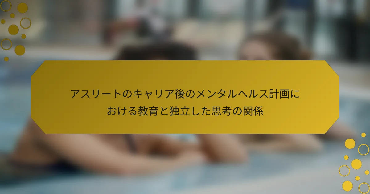アスリートから市民生活への移行は、アイデンティティの喪失や孤立を含む重要なメンタルヘルスの課題をもたらします。教育は独立した思考を高め、引退したアスリートにこれらの問題を乗り越えるための重要なスキルを提供します。研究によると、教育を受けたアスリートは専門的な助けを求める可能性が高く、より良いメンタルヘルスの結果をもたらします。生涯学習やコミュニティサポートシステムに参加することは、彼らのキャリア後の旅においてレジリエンスと適応力をさらに促進します。 教育はアスリートのキャリア後の独立した思考にどのように影響しますか? 教育は、アスリートのキャリア後の独立した思考を大幅に高め、彼らに重要なスキルを提供します。教育は分析能力を育み、アスリートが自分のメンタルヘルスのニーズを効果的に評価できるようにします。研究によると、教育を受けたアスリートは専門的な助けを求める可能性が高く、全体的な幸福感が向上します。さらに、教育は生涯学習を促進し、アスリートがスポーツキャリアの後に新しい課題や環境に適応することを奨励します。この適応力は、他の職業や個人的な取り組みに成功裏に移行するために重要です。 引退したアスリートに利用可能な主な教育の道は何ですか? 引退したアスリートは、独立した思考を高め、メンタルヘルスをサポートするさまざまな教育の道を追求できます。選択肢には、学位プログラム、職業訓練、メンターシップ、オンラインコースが含まれます。各道は、スキルの開発や個人的な成長など、独自の利点を提供します。たとえば、学位プログラムは構造化された学習を提供し、職業訓練は実践的なスキルに焦点を当てます。オンラインコースは柔軟性を提供し、個々のスケジュールに合わせることができます。これらの教育の道に参加することは、認知的な関与と感情的な幸福感を促進し、キャリア後の移行を成功させるために重要です。 市民生活に移行するアスリートのための正式な教育オプションは何ですか? 市民生活に移行するアスリートは、学位プログラム、職業訓練、オンラインコースなど、さまざまな正式な教育オプションを追求できます。これらの教育の道は、独立した思考を促進し、メンタルヘルスの計画を強化します。 学位プログラム(学士号や準学士号など)は、構造化された学習環境を提供します。職業訓練は、貿易や技術などのキャリアのための特定のスキルに焦点を当てます。オンラインコースは柔軟性を提供し、アスリートが自分のペースで学ぶことを可能にします。 研究によると、教育はメンタルヘルスに良い影響を与えます。教育に従事するアスリートは、自己肯定感や目的意識の向上を報告することが多いです。教育と独立した思考の関係は、成功した移行にとって重要です。 オンラインコースはキャリア後の機会のためにスキルをどのように向上させますか? オンラインコースは、独立した思考と適応力を育むことにより、キャリア後の機会のためにスキルを大幅に向上させます。これらは、アスリートにさまざまな分野に適用可能な知識を提供し、メンタルヘルスとレジリエンスを促進します。研究によると、継続的な教育は元アスリートが新しいキャリアに成功裏に移行するのを助け、認知的柔軟性や問題解決能力を向上させます。オンラインプラットフォームは、個々のニーズに合わせた柔軟な学習を提供し、教育をアクセスしやすく、関連性のあるものにします。 批判的思考は元アスリートのメンタルヘルスにどのような役割を果たしますか? 批判的思考は、キャリア後の計画において独立した思考を育むことにより、元アスリートのメンタルヘルスを大幅に向上させます。これにより、彼らは自分の感情や経験を批判的に評価し、より良い対処戦略を導き出すことができます。研究によると、反省的な実践に従事するアスリートは、不安や抑うつのレベルが低いことを報告しています。さらに、批判的思考スキルを発展させることで、元アスリートは現実的な目標を設定し、将来についての情報に基づいた意思決定を行うことができ、全体的な幸福感が向上します。 独立した思考はスポーツ後の生活における意思決定にどのように寄与しますか? 独立した思考は、スポーツ後の生活における意思決定を強化し、適応力とレジリエンスを育みます。独立した思考に従事するアスリートは、選択肢を評価し、情報に基づいた選択を行うための重要なスキルを発展させます。この能力は、キャリアの移行や個人の成長など、キャリア後の課題の複雑さを乗り越えるために不可欠です。研究によると、スポーツキャリアと並行して教育を優先するアスリートは、より高い満足度とメンタルウェルビーイングを報告しています。これらの個人は、独立した思考スキルを活用して実行可能な計画を作成し、スポーツ後の生活でより成功した結果を導くことが多いです。 教育が独立性を育