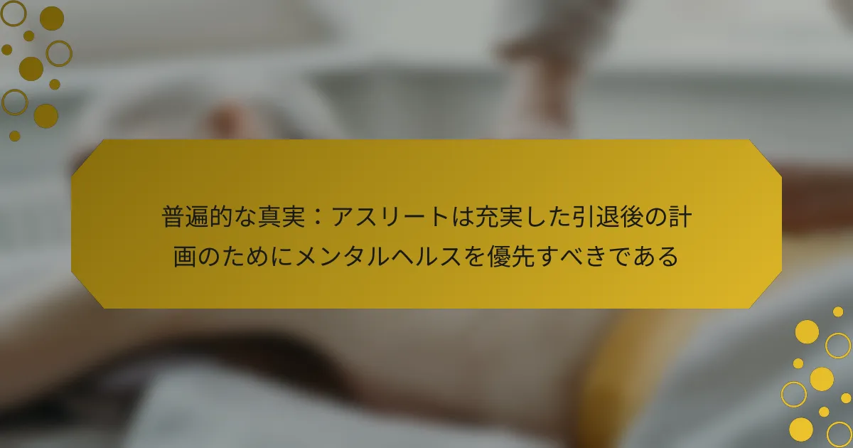 アスリートは、引退後にメンタルヘルスを優先し、感情的な幸福感と充実感を達成する必要があります。競技スポーツからの移行は、アイデンティティの喪失や不安の増加を引き起こす可能性があります。強力なサポートネットワークを構築し、セルフケアの実践に取り組み、専門的な指導を求めることが重要な戦略です。生涯にわたるスキルを活用し、地域社会への参加を通じて、キャリア後の満足感をさらに高めることができます。 引退後のアスリートにとってメンタルヘルスが重要な理由は何ですか? アスリートは、感情的な幸福感と充実感を確保するために、引退後にメンタルヘルスを優先する必要があります。競技キャリアからの移行は、アイデンティティの喪失や抑うつを引き起こす可能性があり、メンタルヘルスのサポートが不可欠です。研究によると、引退したアスリートは一般の人々と比較して、不安や気分障害の発生率が高いことが示されています。強力なサポートネットワークを構築し、メンタルヘルスリソースに参加することで、この移行を楽にすることができます。さらに、キャリア中に発展させた生涯スキルは、新しい機会に活用でき、目的意識と安定感を育むことができます。メンタルヘルスを優先することは、単に有益であるだけでなく、充実したキャリア後の生活には不可欠です。 引退したアスリートが直面する一般的なメンタルヘルスの課題は何ですか? 引退したアスリートは、抑うつ、不安、アイデンティティの危機、社会的孤立などのメンタルヘルスの課題に直面することが一般的です。これらの問題は、競技スポーツからの急激な移行から生じ、喪失感や将来への不確実性を引き起こします。研究によると、約35%の引退したアスリートが重大なメンタルヘルスの問題を経験しており、積極的なメンタルヘルス戦略の必要性が強調されています。サポートシステムやメンタルヘルスリソースを通じてこれらの課題に対処することは、充実したキャリア後の生活にとって重要です。 アスリートから市民への移行はメンタルウェルビーイングにどのように影響しますか? アスリートから市民への移行は、メンタルウェルビーイングに大きな影響を与える可能性があり、しばしばアイデンティティの喪失や抑うつなどの課題を引き起こします。アスリートはしばしば自分自身をスポーツによって定義し、引退は空虚感を生むことがあります。研究によると、引退したアスリートの35%がこのアイデンティティの変化によりメンタルヘルスの問題を経験しています。キャリア後の計画中にメンタルヘルスを優先することは、充実感を得るために不可欠です。セラピーに参加し、新しい情熱を追求し、社会的なつながりを維持することで、これらの影響を軽減することができます。積極的なアプローチは、レジリエンスを育み、スポーツ後の生活の複雑さを乗り越えるのに役立ちます。 キャリア後の不安に寄与する心理的要因は何ですか? アスリートのキャリア後の不安は、アイデンティティの喪失、目的の欠如、社会的孤立などの心理的要因から生じます。アスリートはしばしば自分自身をスポーツによって定義するため、競技後の生活に移行する際に苦労します。このアイデンティティの危機は、空虚感や不安を引き起こす可能性があります。さらに、構造化されたライフスタイルの急激な終わりは、無目的感を助長することがあります。元アスリートがチームのつながりを失うことで社会的孤立が生じ、孤独感や不安感が悪化することがあります。キャリア後の計画においてメンタルヘルスを優先することは、充実感と幸福感を達成するために重要です。 引退後のメンタルヘルスを支える普遍的な戦略は何ですか? アスリートは、セルフケア、社会的つながり、専門的なサポートを優先することで、引退後のメンタルヘルスを向上させることができます。キャリア後の計画中にメンタルヘルスを強調することは、より大きな充実感につながります。 セルフケアの実践には、定期的な身体活動、健康的な食事、マインドフルネスの技術が含まれます。家族や友人との関わりは、感情的なサポートを育み、孤立感を軽減します。専門的なカウンセリングやセラピーを求めることで、移行に対処するための適切な戦略を得ることができます。 研究によると、社会的なつながりやメンタルヘルスリソースを維持しているアスリートは、引退後の生活満足度が高いと報告しています。メンタルヘルスに焦点を当てた移行プログラムは、全体的な幸福感を大幅に向上させることができます。 アスリートはどのように持続可能なキャリア後の計画を立てることができますか? アスリートは、メンタルヘルスを優先し、サポートネットワークを構築することで、持続可能なキャリア後の計画を立てることができます。構造化されたアプローチには、スポーツ以外の情熱を特定し、専門的な指導を求め、社会的なつながりを維